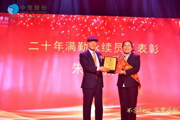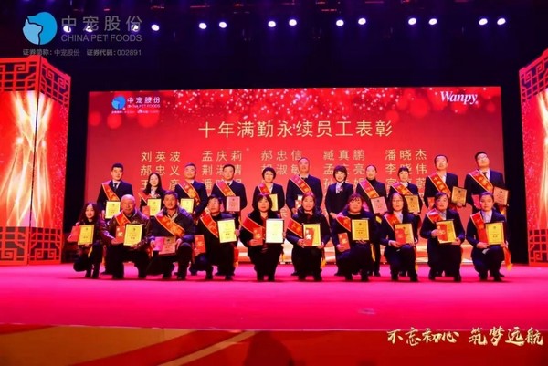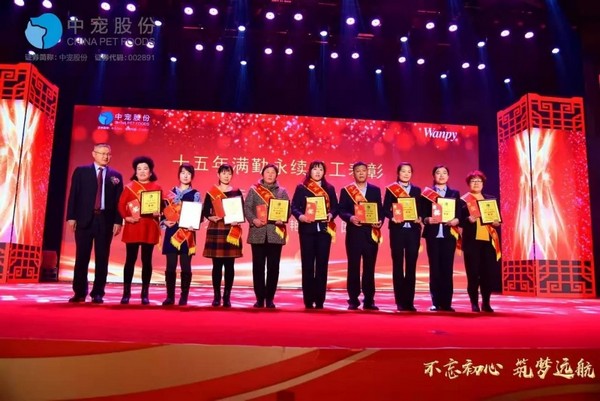 中宠股份取得今天的成绩,离不开全体员工的辛勤努力,更离不开优秀员工骨干起到的模范带头作用。付出终有回报,年会中,中宠股份常务副总裁江移山先生对在公司奋斗十年、十五年、二十年的同事颁发了“满勤永续员工”荣誉称号,感谢大家对公司始终如一的陪伴和坚守,为公司发展所付出的汗水和努力!并对2019年度先进个人和团队进行了隆重表彰,感谢他们一年来的辛勤付出!