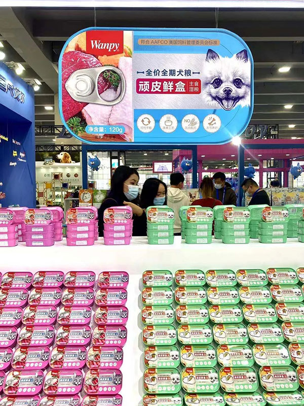 在Wanpy顽皮展台上,Wanpy鲜封包、犬用三明治、顽皮鲜盒等产品悉数亮相。同时,Wanpy还展出了两款新品主粮——顽皮鲜肉无谷冻干粮和顽皮双鲜冻干双拼粮。