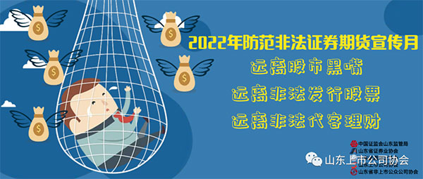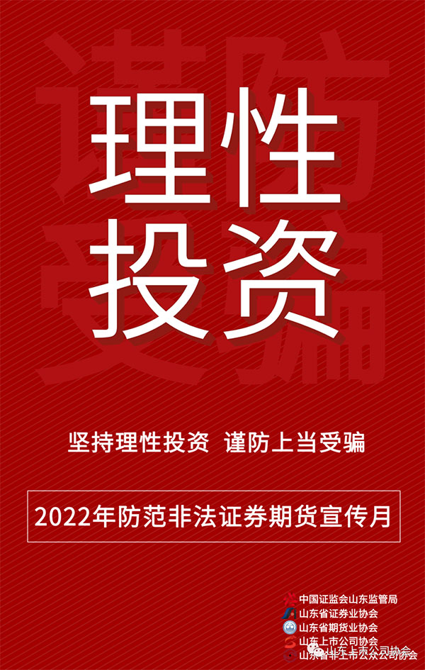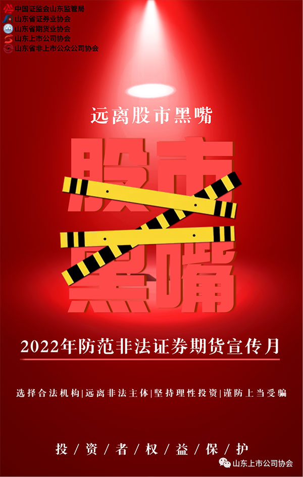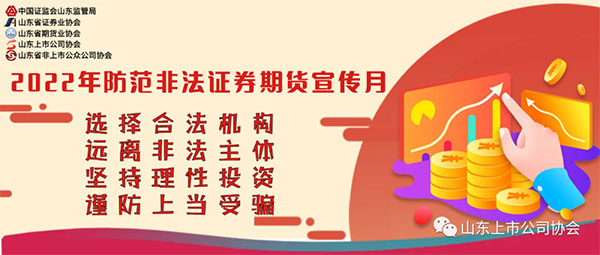 烟台CQ9电子官方版股份有限公司为响应山东证监局号召,推出“2022年防范非法证券期货宣传月及5·15全国投资者保护宣传日”活动。围绕“选择合法机构,远离非法主体,坚持理性投资,谨防上当受骗”的主题进行宣传,贯彻落实中办、国办《关于依法从严打击证券违法活动的意见》要求,加大防范非法证券期货活动宣传力度,增强人民群众对非法证券期货活动的防范意识和能力。