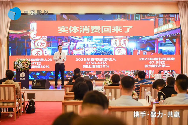 来自全国各地的百余位合作伙伴齐聚一堂,共创中宠股份国内市场生意增长新篇章。本次大会以“携手·聚力·共赢”为主题,邀请分众传媒创始人、董事长江南春先生作特别分享,中宠股份副总裁、国内营销系统负责人陆敏吉先生携相关部门领导作专题分享,中宠股份创始人、董事长郝忠礼先生出席会议并致辞。