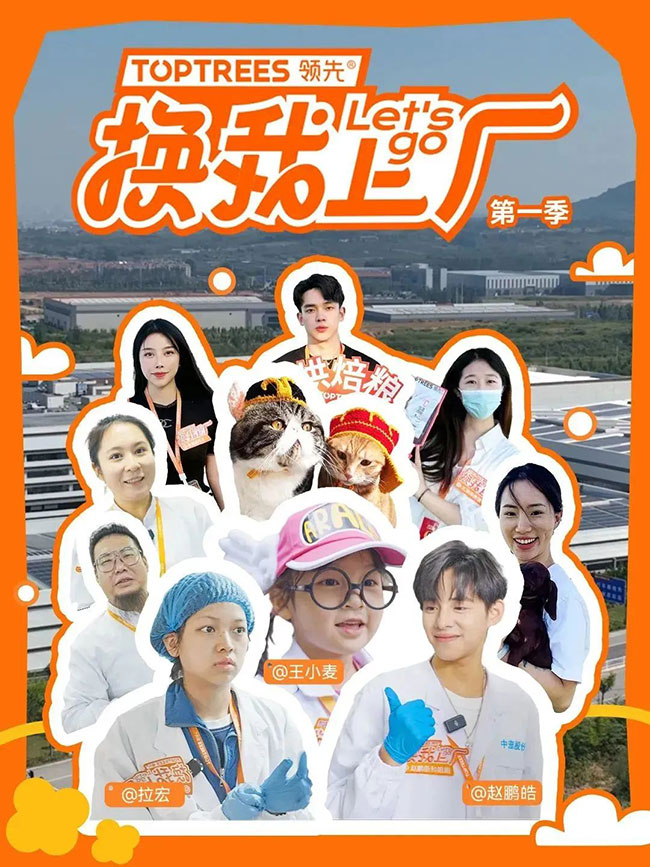 在第一季《换我上厂》营销活动中,Toptrees领先®邀请小麦、拉宏、赵鹏皓等10位跨界达人进入Toptrees领先®的产品生产工厂,深度参与烘焙粮的生产日常。将宠粮大厂的真实环境及工作状态呈现给各位养宠家长,向用户传递来自上市工厂的安心和放心。