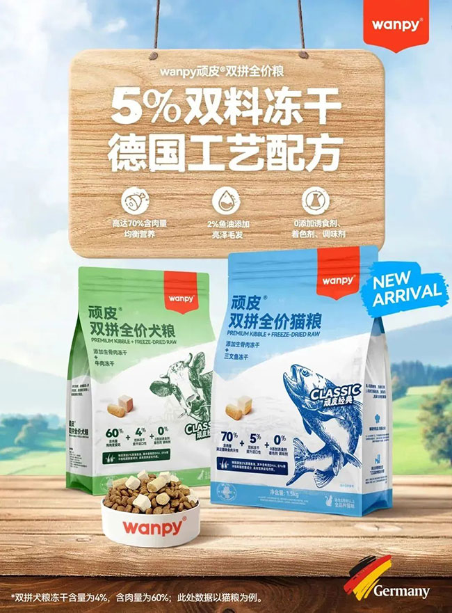 9月,wanpy顽皮®线下明星单品双拼主粮迎来3.0新升级。从科学喂养的用户需求出发,将“生骨肉”和“冻干”相结合,在原有真肉冻干的基础上,组合添加主食级生骨肉冻干,适口性更好,营养价值更全,再辅佐以2%深海鱼油,一袋满足萌宠每餐的美味享受,丰富线下消费者购买选择。
