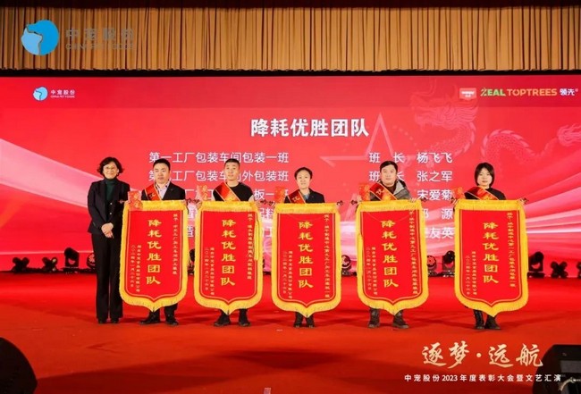 郝董讲话过后,表彰大会暨文艺汇演正式开始。大会现场,象征荣誉的乐音一次次响起,获得中宠股份2023年度评选表彰荣誉的305名优秀个人及31支团队依次登台领奖。在这个光荣与梦想交织的时刻,郝董和集团领导分别为获得奖项的个人与团队颁发奖杯和荣誉证书。