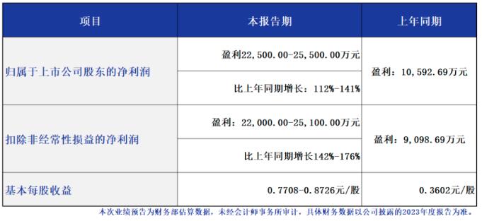 1月30日,中宠股份发布2023年度业绩预告。2023年全年归属于上市公司股东的净利润预计为2.25亿-2.55亿元,同比增长112%-141%;扣除非经常性损益的净利润预计为2.2亿-2.51亿元,同比增长142%-176%,基本每股收益0.7708-0.8726元。