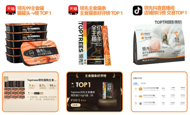 产品方面, 2023 年,Toptrees领先®烘焙猫粮将“低敏长壮”从 0 到 1 夯入用户心智,获得新手养猫人群的青睐,成为了烘焙粮天猫行业Top品牌。与此同时,Toptrees领先®主食罐调整重心至生骨肉系列,持续拓展新客,力争成为国产主食罐国民度Top 1 产品。此外,Toptrees领先®主食猫条在三季度增加小红书渠道种草后,始终保持品牌TOP 3 ,最高实现TOP 1 的好成绩。