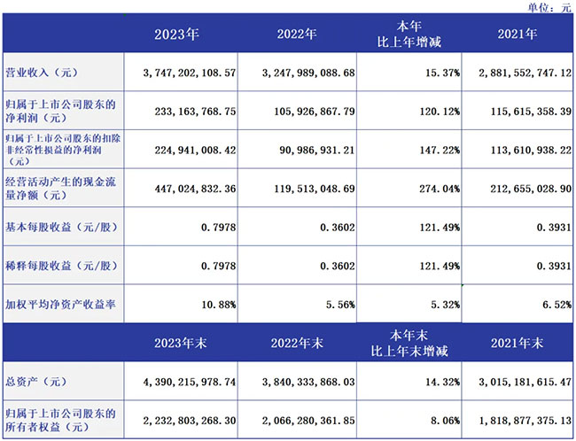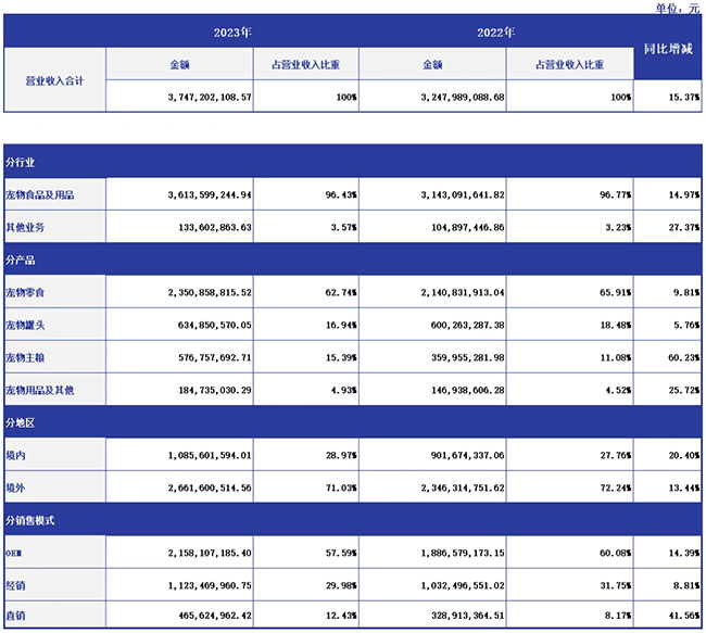 4 月 22 日,中宠股份发布 2023 年年报。公司 2023 年全年实现营业收入 37.47 亿元,同比增长 15.37 %,归属于上市公司股东的净利润为 2.33 亿元,同比增长 120.12 %,基本每股收益 0.7978 元。
