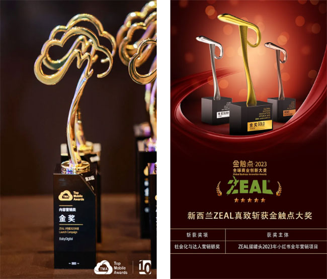 营销方面,凭借优秀的品牌影响力,ZEAL0号罐 2023 年度Launch Campaign成功被评为第 10 届TMA大奖内容营销类金奖,ZEAL猫罐头 2023 年小红书全年营销项目也成功获得 2023 金触点大奖·社会化与达人营销银奖,成为推动品牌营销新发展的典型案例。