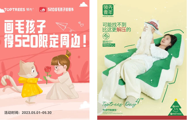 2023 年,Toptrees领先®持续深耕属于品牌长期心智的固定型活动,上半年 520 给毛孩子的情书,下半年Toptrees Day圣诞节,并与宠物行业流浪动物公益趋势相结合,形成品牌固定的节日心智。