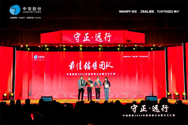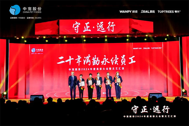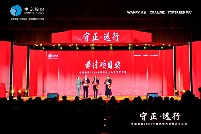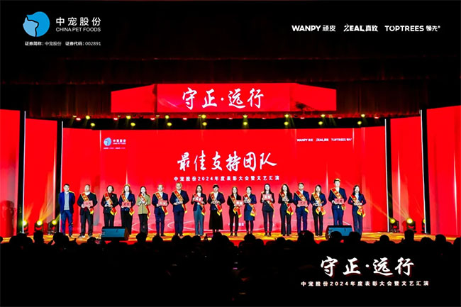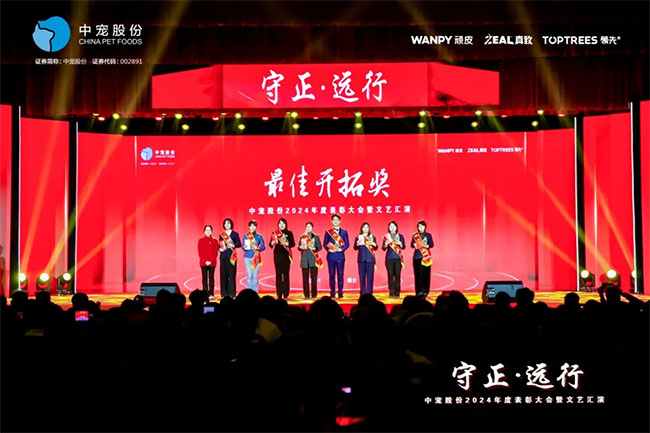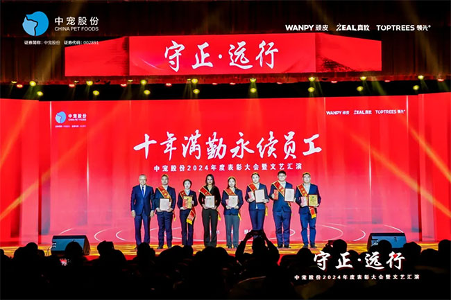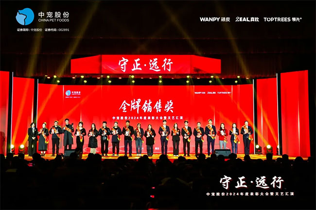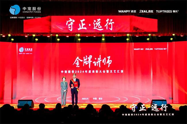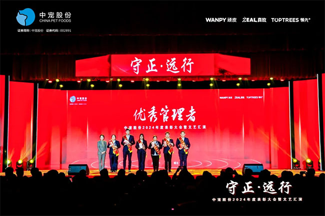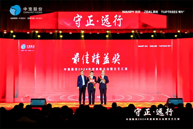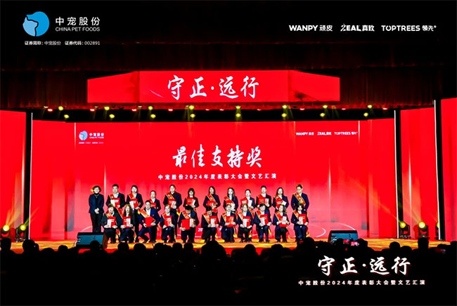 在这充满荣耀与激情的时刻,我们齐聚一堂,共同见证那些在2024年里为中宠股份做出卓越贡献的个人与团队。他们在各自的岗位上拼搏奋进,用实际行动诠释着责任与担当,推动公司不断迈向新高峰,书写着属于中宠股份的辉煌篇章。董事长特别表彰奖的卓越经营贡献;最佳销售团队的攻坚克难、披荆斩棘;中宠新锐奖获得者的奋发进取与朝气蓬勃;海外开拓先锋的勇毅担当;金牌销售奖的奋发与卓越;满勤永续的坚韧与执着;最佳支持团队的默默奉献与坚实后盾;最佳协同奖与最佳项目奖的团队协作与创新突破……他们共同书写了中宠股份27年的辉煌历史,以实际行动传承和弘扬着中宠股份的企业文化,用无畏与拼搏展现着中宠股份品牌的精神力量!
